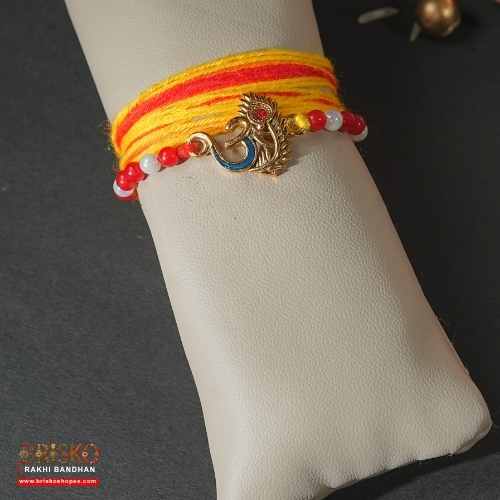 Om Morpankh Rakhi with Yellow-Red Long Cotton Thread – Spiritual Handmade Rakhi for Brother