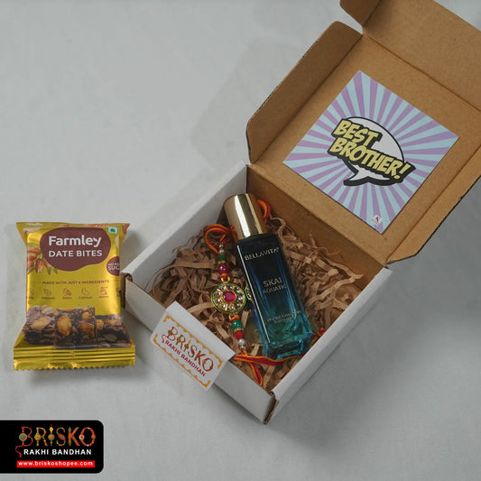 Box Rakhi Hamper – Bellavita Perfume & Healthy Treat with Rakhi for Brother