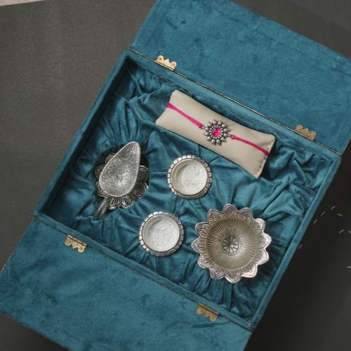 Handmade Rakhi Gift Box – Silver Oxidised Rakhi with Puja Thali Set & Velvet Floral Box