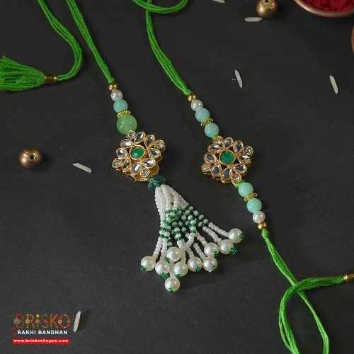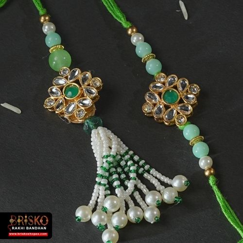 Celebrate Raksha Bandhan in style with this handcrafted bhaiya bhabhi rakhi set, featuring floral kundan motifs and cascading pearl tassels. The elegant green thread with golden accents adds a festive charm, while the intricate beadwork reflects royal artistry.