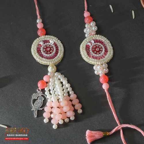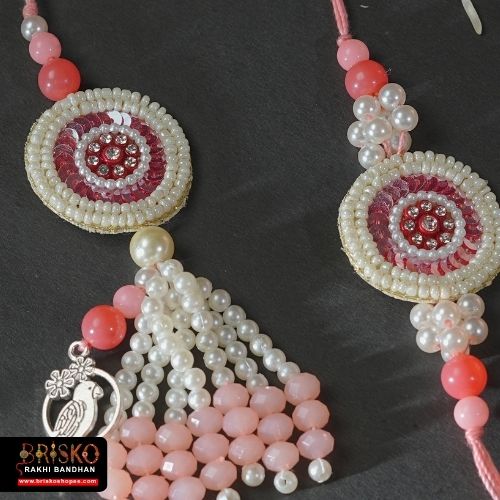 Celebrate the sacred sibling bond with this beautiful handmade rakhi set designed for Bhaiya and Bhabhi. The round pearl design with soft pink beads and intricate threadwork creates a stunning, graceful look that blends traditional charm with modern elegance.