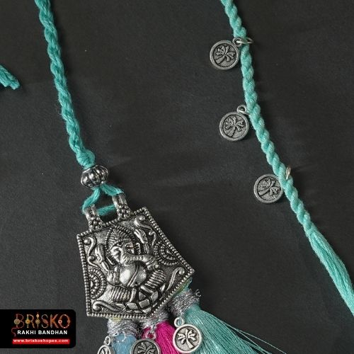 Bless your bhabhi with strength, wisdom, and elegance this Raksha Bandhan with our handmade rakhi featuring a beautifully carved oxidised silver Ganesha charm. Adorned with vibrant pink, teal, and blue tassels, this Lumba rakhi carries the blessings of Lord Ganesha – remover of obstacles and bringer of prosperity.